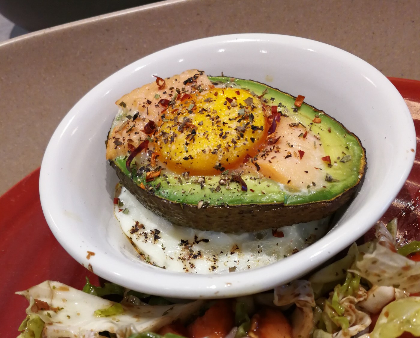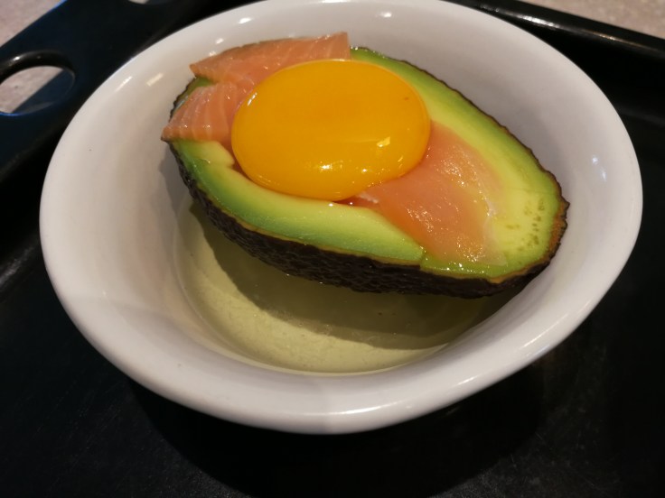 5 – Cassez l’oeuf et ajoutez le au centre. Si votre avocat était petit, il y a de grandes chances que le blanc s’échappe, d’où l’intérêt de la coupelle 😉, ce n’est pas grave.